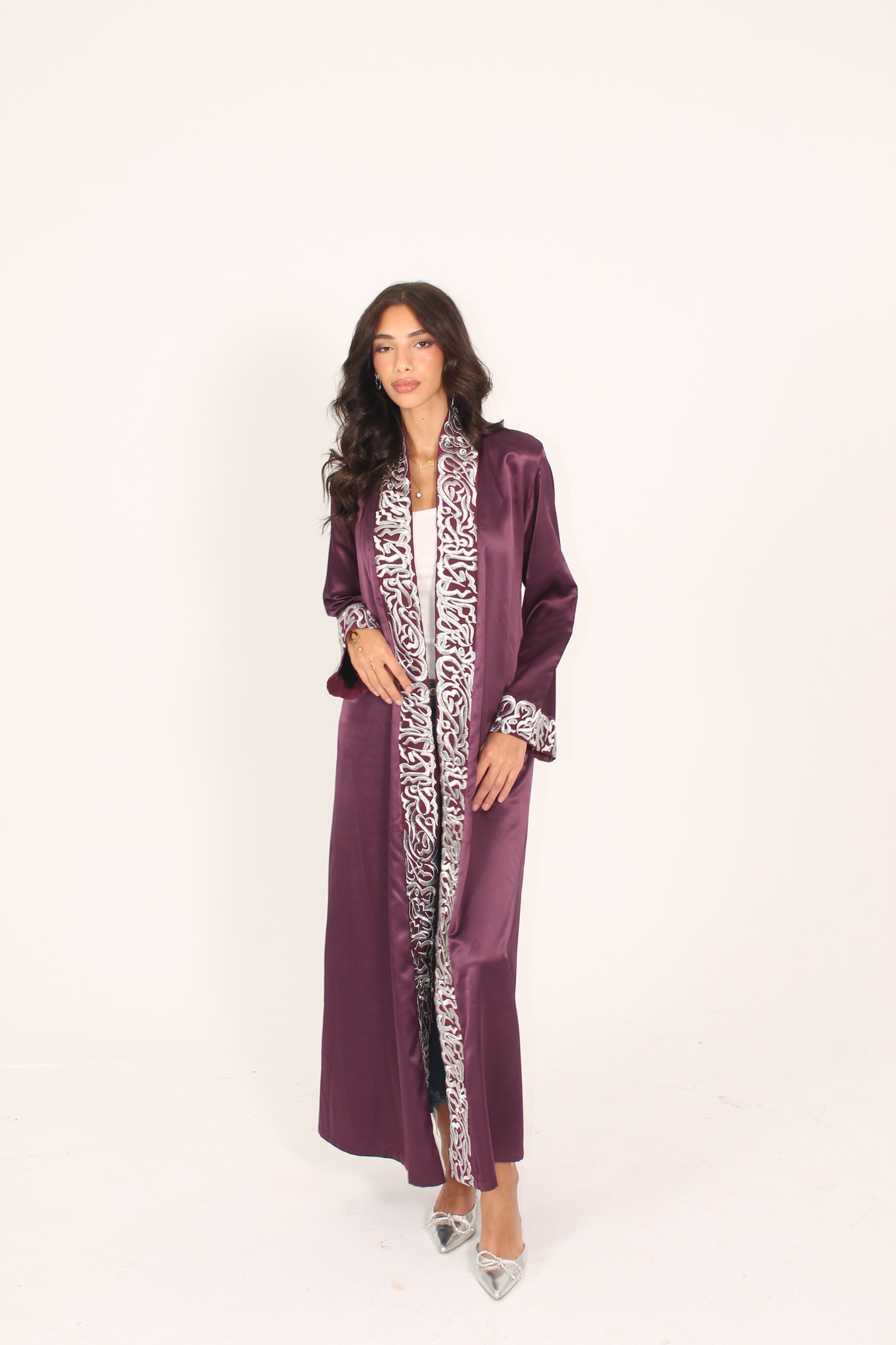 The Amethyst Empress Luxe Abaya features a rich plum-amethyst tone with a luminous textured finish that reflects light beautifully from every angle. The dramatic cape-like drape creates fluid movement and regal presence, elevating this piece into a true statement of couture modest wear.
