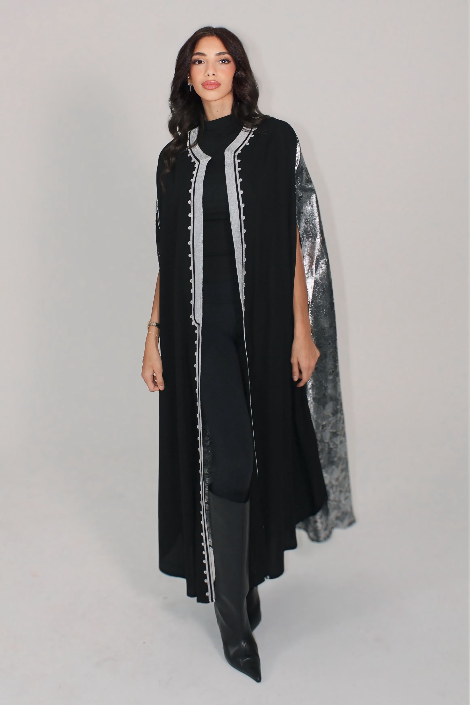 Designed for Ramadan evenings, Eid celebrations, and elegant formal gatherings, this piece embodies modern modest couture. The elongated cut enhances its graceful flow, while the lace detailing adds a soft feminine touch to the bold, structured base.