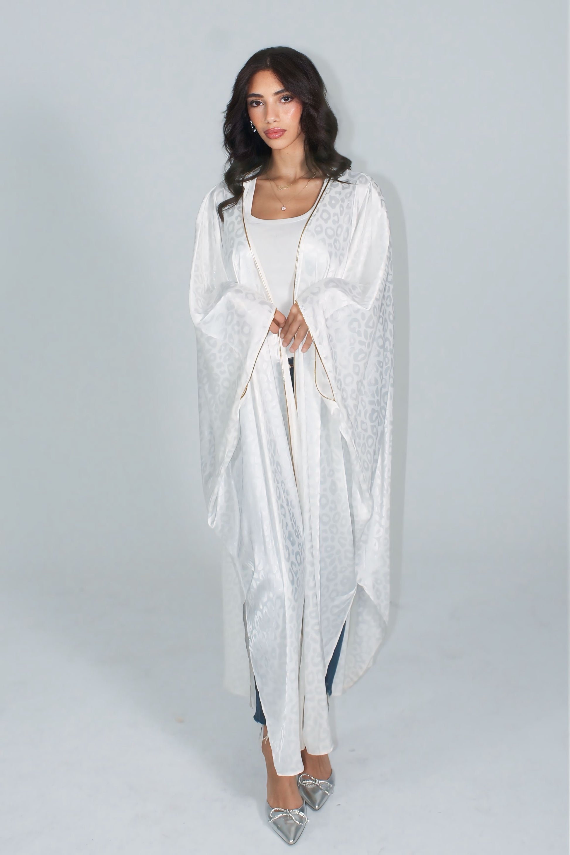 The Pearl Veil Luxe Abaya is crafted in a soft ivory-white tone with a subtle textured finish that reflects light with delicate sophistication. Its flowing, open silhouette drapes effortlessly, creating a graceful and elongated look that embodies timeless modest luxury.
